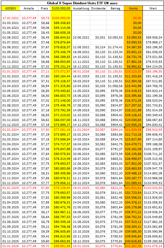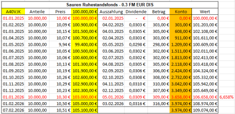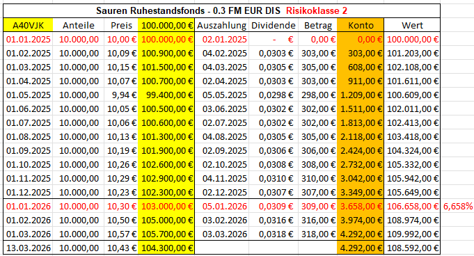 Hier sehen wir, wie monatlich 0,3% (also ca. 300,-€) real ausgeschüttet wurden.