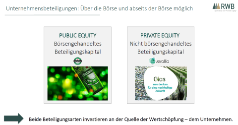 Etwas zur Erklärung und Orientierung: man unterscheidet bei Investitionen mit Eigenkapital zwischen zwei Anlagevarianten Public Equity und Private Equity.